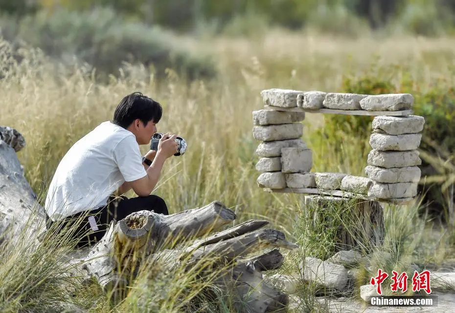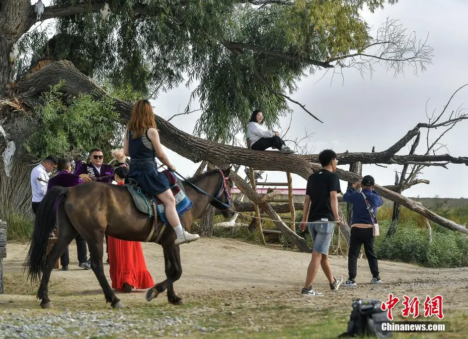 8月27日,新疆阿勒泰地区哈巴河县齐巴尔镇吉林新村,热播剧《我的阿勒泰》取景地“彩虹布拉克”,游客沉浸式体验剧中场景。据了解,随着电视剧《我的阿勒泰》爆火,剧中的取景地也接连出圈,全国各地的游客、剧迷纷至沓来,体验当地原生态的风土人情。图为游客观光游览剧中的“巴太树”。中新社记者 刘新 摄