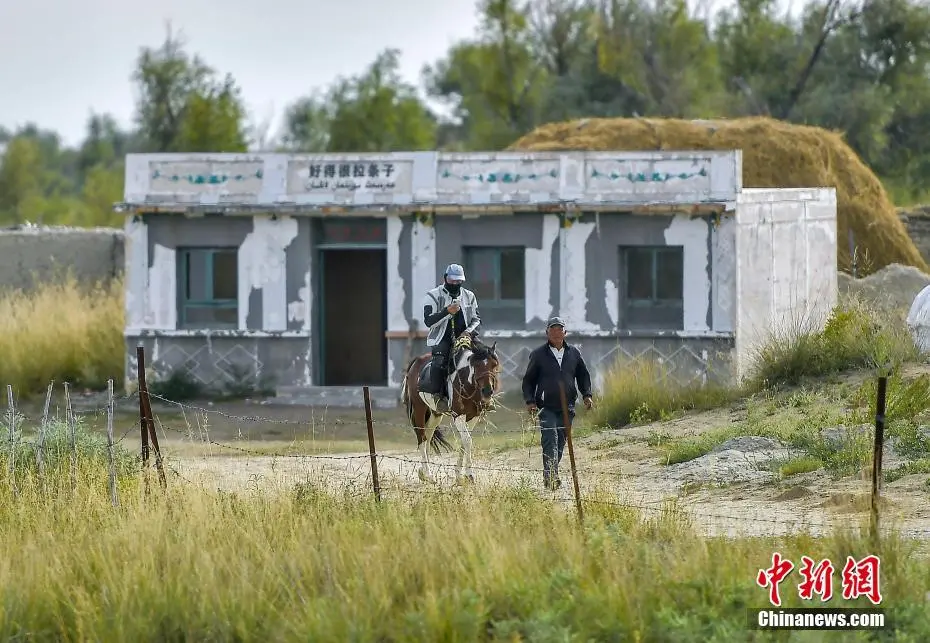 8月27日,新疆阿勒泰地区哈巴河县齐巴尔镇吉林新村,热播剧《我的阿勒泰》取景地“彩虹布拉克”,游客沉浸式体验剧中场景。据了解,随着电视剧《我的阿勒泰》爆火,剧中的取景地也接连出圈,全国各地的游客、剧迷纷至沓来,体验当地原生态的风土人情。图为游客骑马从“好得很拉条子”取景地前经过。中新社记者 刘新 摄