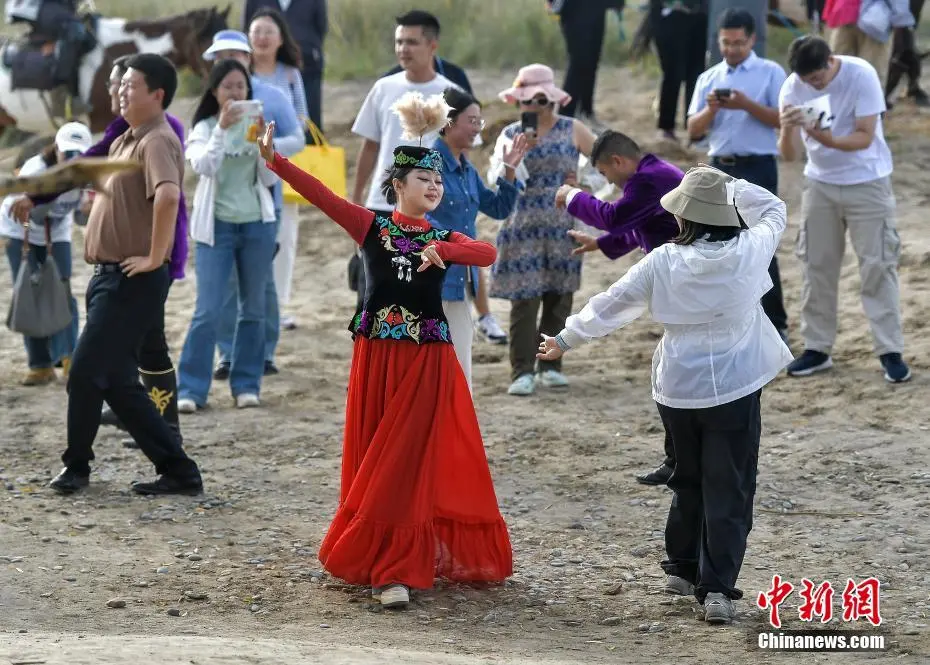 8月27日,新疆阿勒泰地区哈巴河县齐巴尔镇吉林新村,热播剧《我的阿勒泰》取景地“彩虹布拉克”,游客沉浸式体验剧中场景。据了解,随着电视剧《我的阿勒泰》爆火,剧中的取景地也接连出圈,全国各地的游客、剧迷纷至沓来,体验当地原生态的风土人情。图为身着民族服饰的演员与游客互动,跳起哈萨克族舞蹈《黑走马》。中新社记者 刘新 摄