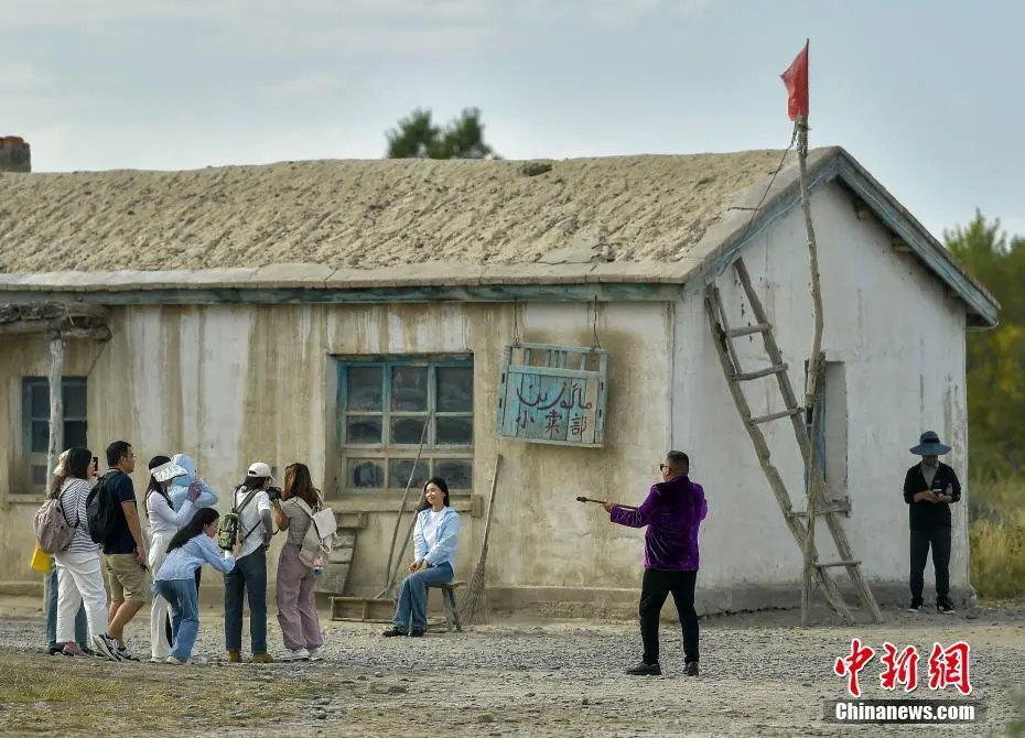 8月27日,新疆阿勒泰地区哈巴河县齐巴尔镇吉林新村,热播剧《我的阿勒泰》取景地“彩虹布拉克”,游客沉浸式体验剧中场景。据了解,随着电视剧《我的阿勒泰》爆火,剧中的取景地也接连出圈,全国各地的游客、剧迷纷至沓来,体验当地原生态的风土人情。图为游客被剧中的“电视机”所吸引。中新社记者 刘新 摄