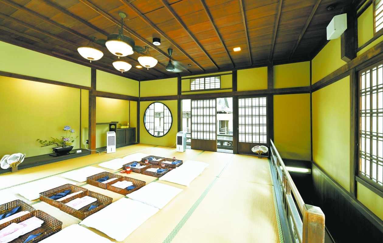 本馆屋顶的挑高阁楼名为“振鹭阁”,四壁镶满进口的红色玻璃。当灯光点亮时,会发出耀眼的光芒,营造出独特的氛围,照亮温泉小镇的夜空,格外引人注目。阁中悬挂的太鼓被称为“刻太鼓”,每天会在清晨6点敲响6次,正午12点敲响12次,傍晚6点敲响6次,以此报时。这个声音被选为“最想要保留下去的100种日本的声音”,许多人特地来此,只为聆听独特的报时声。