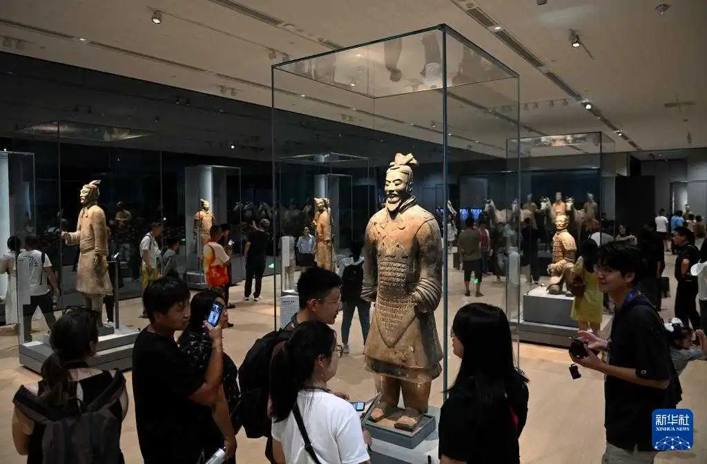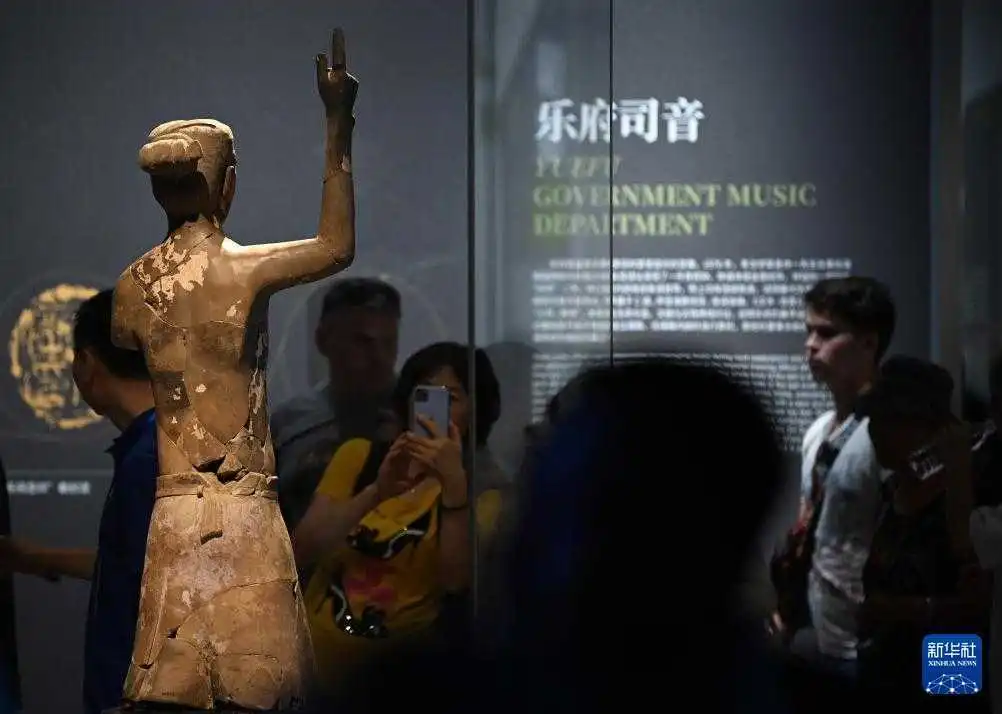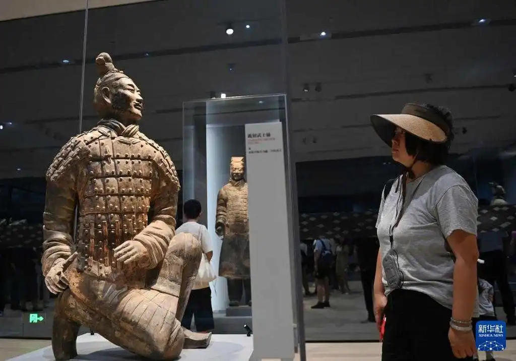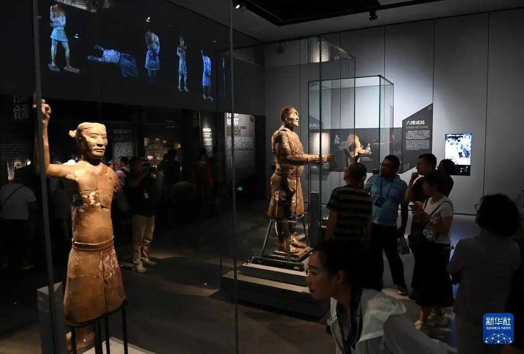 9月8日,在秦始皇帝陵博物院,观众在观看“千古一帝的地下王国——秦始皇陵考古发现展”上展出的百戏俑。新华社记者 李一博 摄