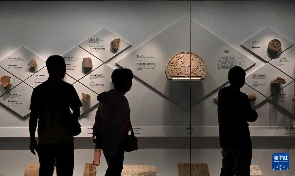9月8日,在秦始皇帝陵博物院,观众观看“千古一帝的地下王国——秦始皇陵考古发现展”上展出的建筑构件。新华社记者 李一博 摄