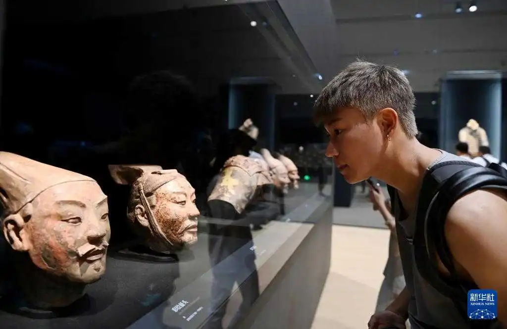 9月8日,在秦始皇帝陵博物院,观众在观看“千古一帝的地下王国——秦始皇陵考古发现展”上展出的彩绘俑头。新华社记者 李一博 摄