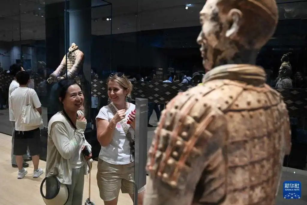 9月8日,在秦始皇帝陵博物院,观众在拍摄“千古一帝的地下王国——秦始皇陵考古发现展”上展出的兵马俑。新华社记者 李一博 摄