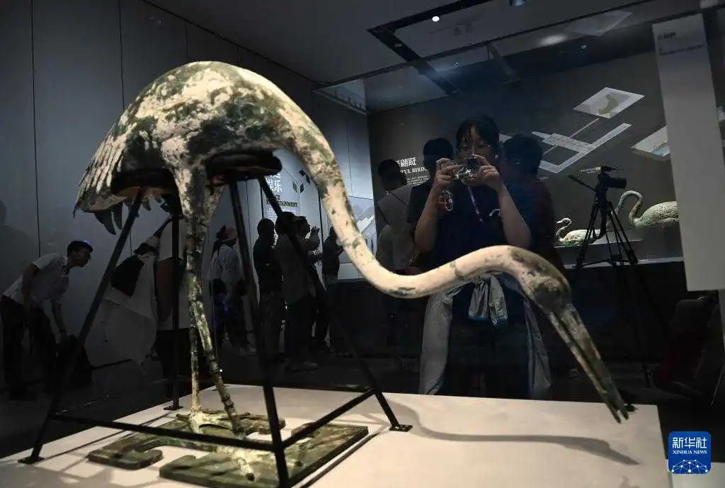 9月8日,在秦始皇帝陵博物院,观众在拍摄“千古一帝的地下王国——秦始皇陵考古发现展”上展出的青铜鹤。新华社记者 李一博 摄