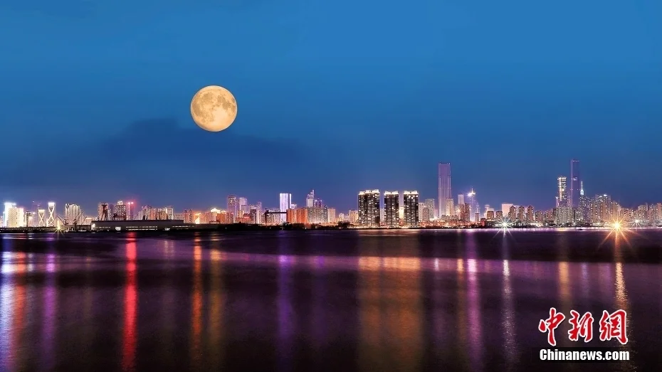 9月17日,辽宁大连,今年中秋佳节恰逢“超级月亮”,在位于辽宁大连的钻石湾世界滨海公园,一轮满月跃出海面,高悬在灯火璀璨的城市建筑群上空,与海面倒映五彩斑斓的光影相映成趣。图/ICphoto
