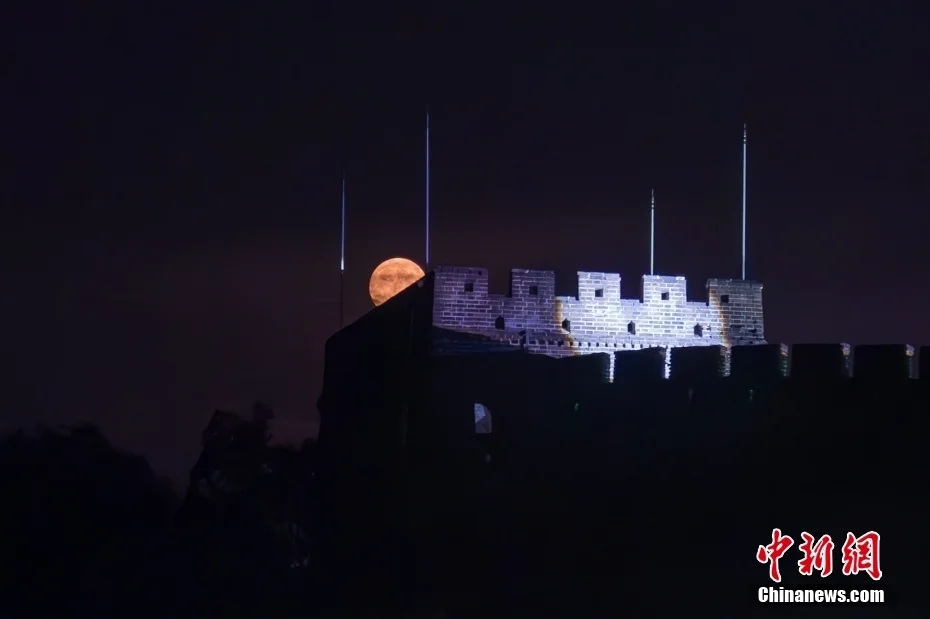 9月17日,中国传统中秋佳节,一轮明月在北京慕田峪长城上空升起。中新社记者 赵文宇 摄