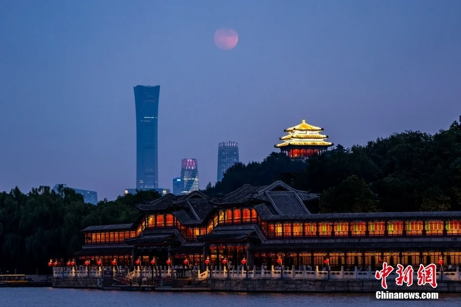 9月17日是中秋佳节,北京上空云层较厚,一轮朦朦胧胧的圆月从东方升起,与万春亭和中国尊等古今建筑构成“古今同框朦胧月”的别致景象。中新社记者 张炜 摄