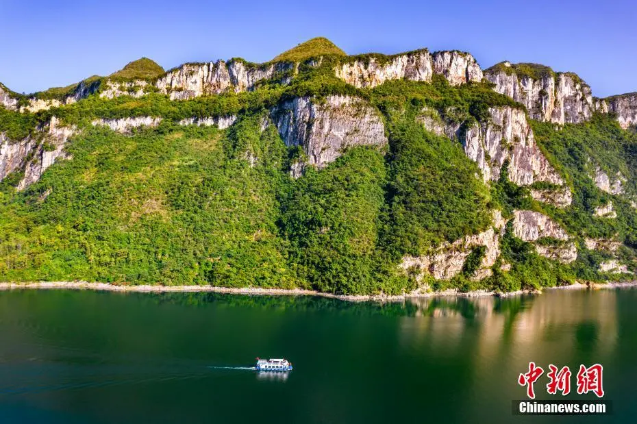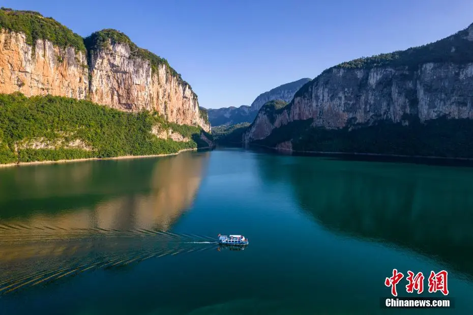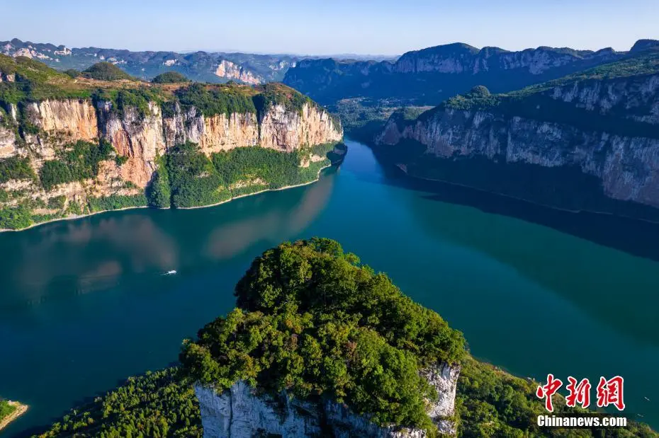 航拍乌江源百里画廊山清水秀、风光旖旎,游客乘船游览观光。史开心 摄