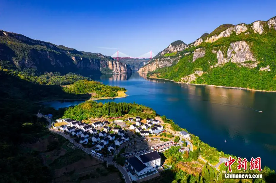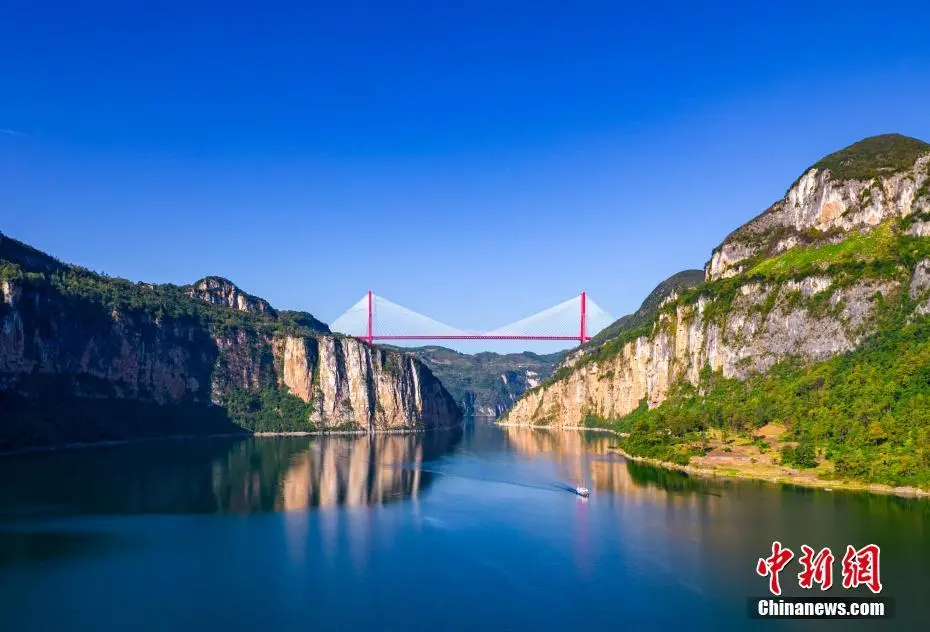 乌江源百里画廊位于贵州省黔西市化屋村,融高峡、平湖、溶洞、飞瀑为一体,山清水秀、风光旖旎。依托多姿多彩的苗族文化、雄奇险峻的乌江峡谷风光和比邻而过的贵黔高速公路等资源优势,化屋村大力发展乡村旅游产业,吸引众多游客前来观光旅游。图为10月23日游客在化屋村乘船游览观光,山、水、桥、船相映成景。史开心 摄