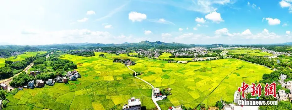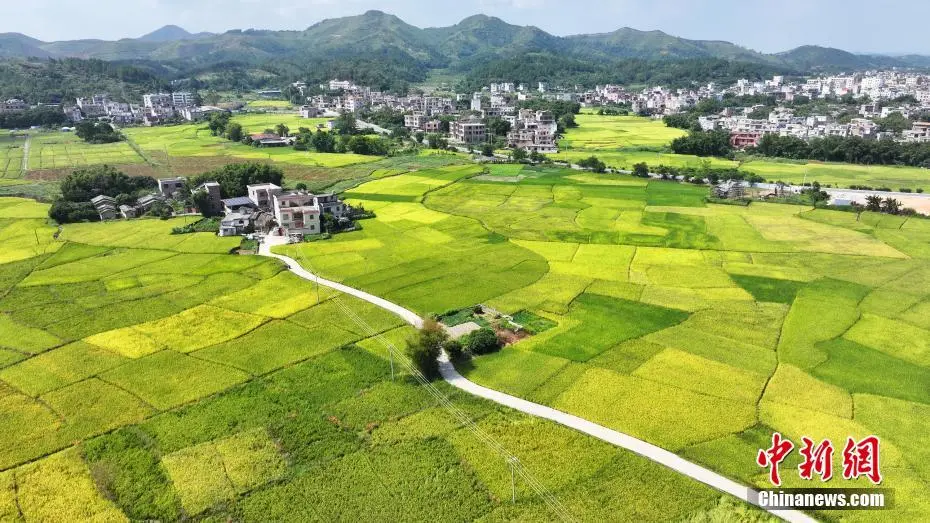10月28日,航拍广西梧州市龙圩区大坡松柏村,金色稻田色彩斑斓,“丰”景如画。潘绍珊 摄