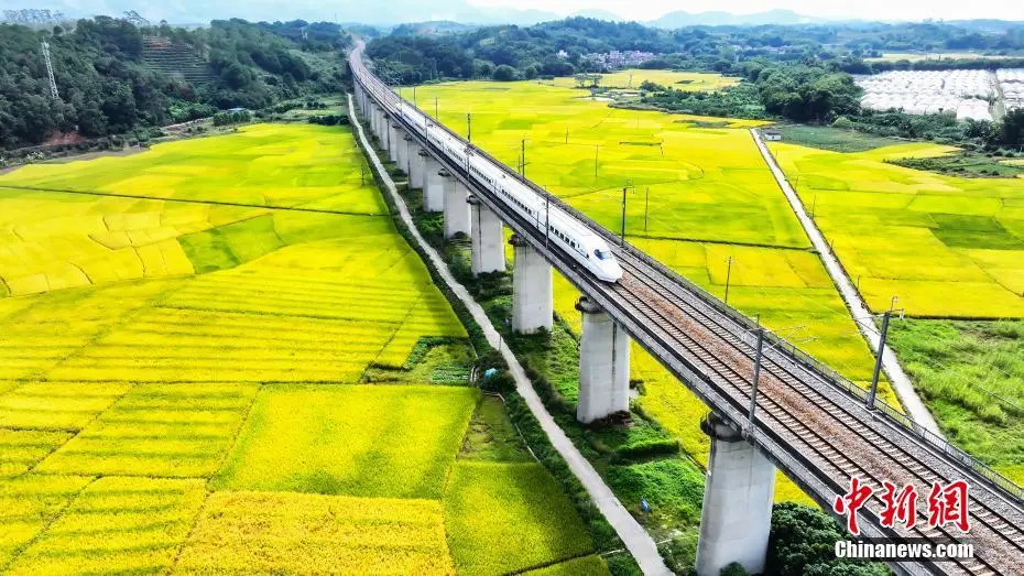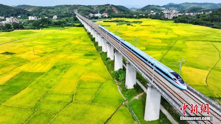 10月28日,航拍广西梧州市龙圩区龙圩镇念村,动车飞驰在金色稻田上。潘绍珊 摄