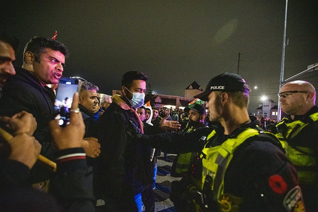 在布兰普顿市一座印度教寺庙发生暴力事件后,数千人于当地时间4日聚集在现场,抗议此事以及当地警察的不作为。警方则试图劝阻这些抗议者。(视觉中国)