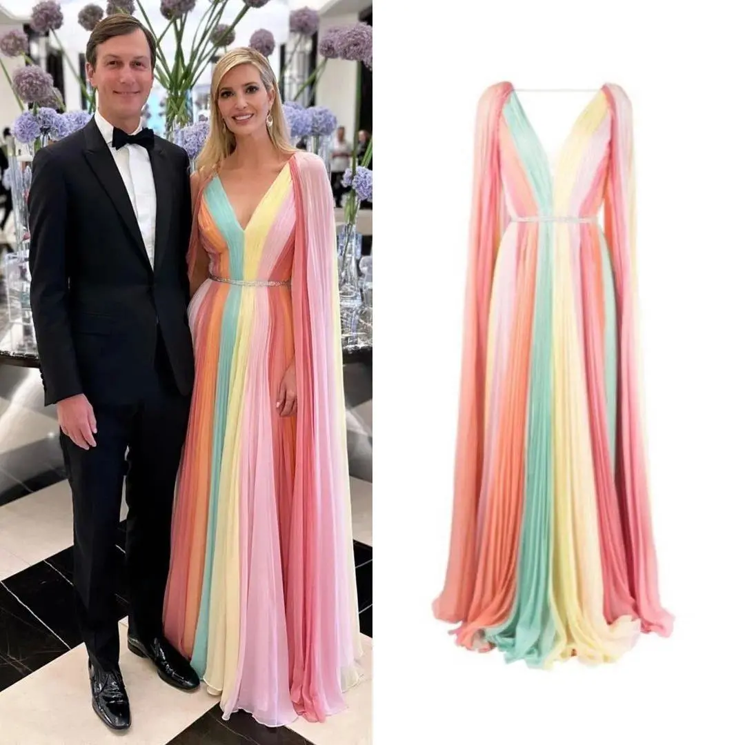偶尔还要凹一下“多巴胺造型”,玩一玩撞色。之前参加约旦王储婚礼时,这条斗篷式彩虹裙来自Jenny Packham。除了伊万卡,凯特、丹麦王储妃玛丽、碧翠丝公主等都是品牌忠粉,主打一个往王室风格上各种靠~