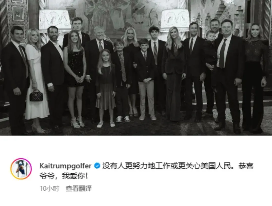 孙女Kai第一时间发了IG祝福自己爷爷当选,晒出的全家福,伊万卡也和川普离得老远(为什么马斯克也加入了这个家?)。到目前为止,伊万卡的社交媒体一点动静都没有~