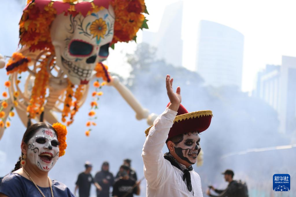 这是11月2日在墨西哥首都墨西哥城拍摄的亡灵节游行现场。