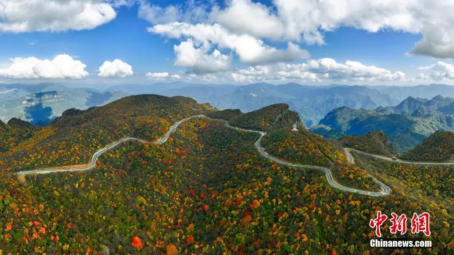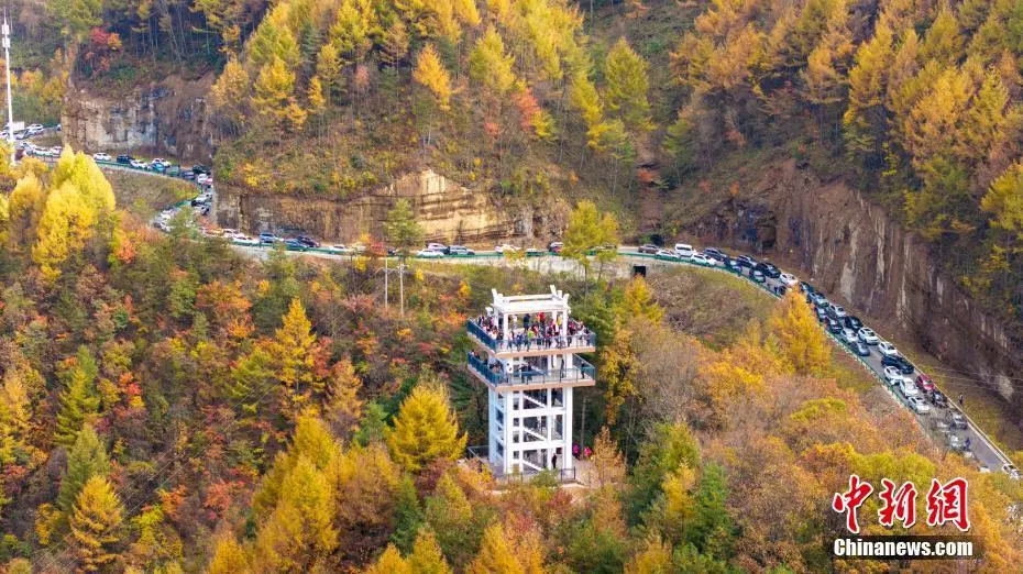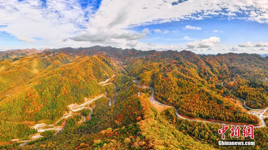 深秋时节,四川省广元市旺苍县米仓山大峡谷盐井河森林公园万山红遍,层林尽染。沿着山势放眼望去,一幅大自然织就的壮美画卷徐徐展开。红叶最佳观赏季这里成了摄影天堂,每天数以万计的游客纷至沓来,大家流连忘返,陶醉于金色的世界里,将最美的风景收入镜头。地处川陕交界的米仓山为中国南北自然分界线——秦岭至大巴山的重要组成部分,多种生物区系在这里交汇重叠,是我国生物多样性最为丰富的地区之一。旺苍县境内红叶景观由水青岗、银杏、枫树等数百种树种组成,主要分布于县城北部山区,以鼓城山——七里峡国家4A级旅游景区、盐井河大峡谷、檬子峡等地最为富集。(无人机图片)苗志勇 摄