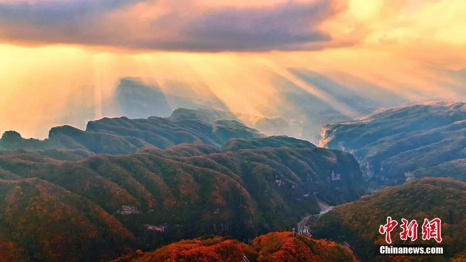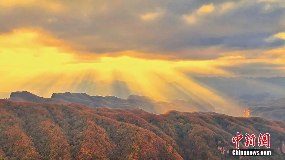 旺苍县米仓山大峡谷盐井河森林公园秋色正浓,霞光万丈美如画。(无人机图片)苗志勇 摄