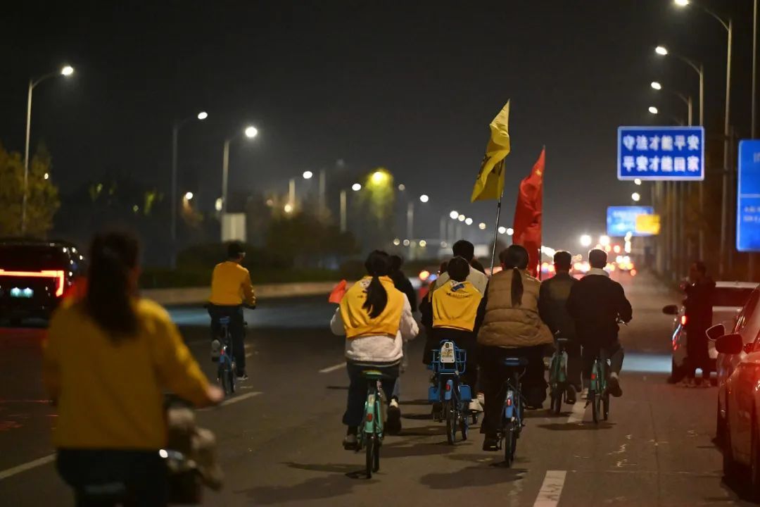 △11月7日晚,郑州大学生骑共享单车沿郑开大道一路向东直奔开封。(图/视觉中国)