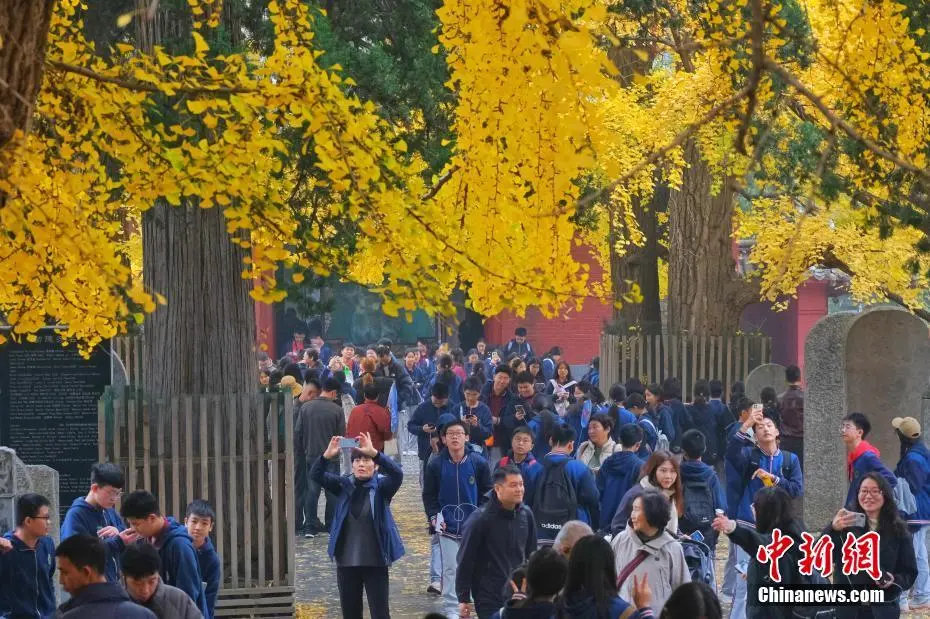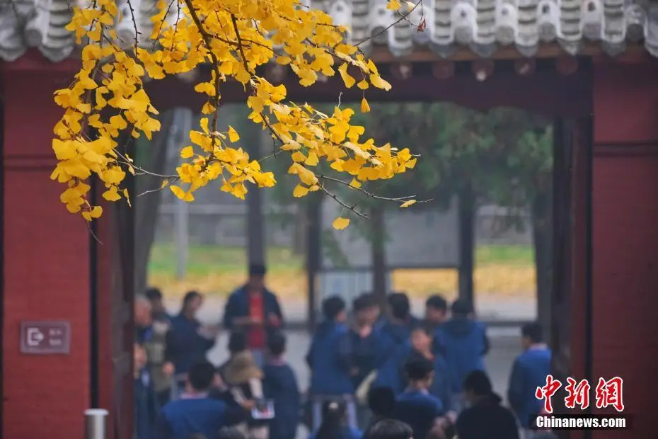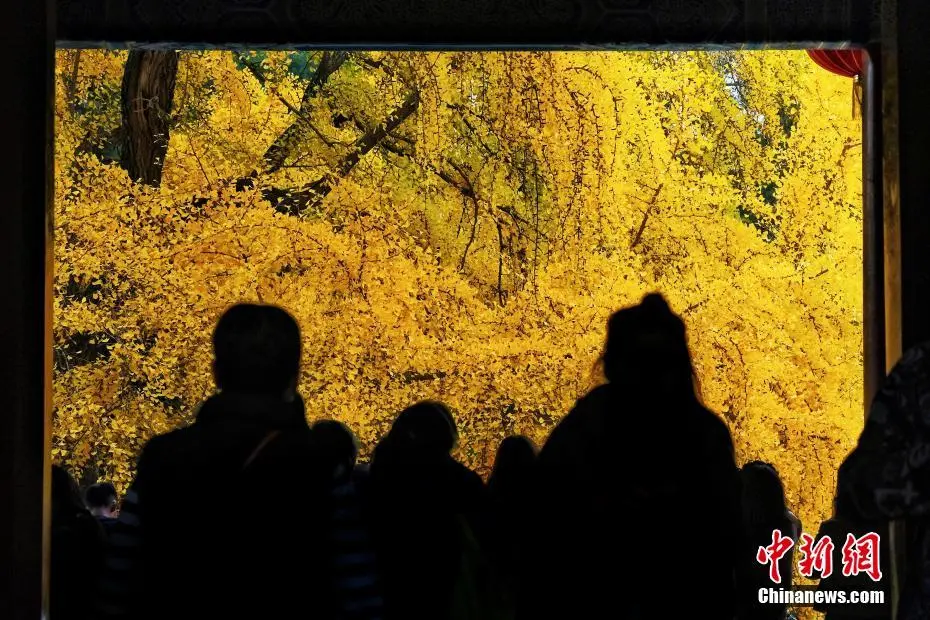 近日,河南登封嵩山少林寺内的千年古银杏树叶子变黄,犹如满树“披金”,进入最佳观赏季,吸引大量游客前来观赏。图为游客在嵩山少林寺内观赏银杏树。王羿 摄