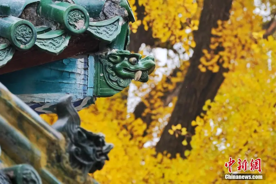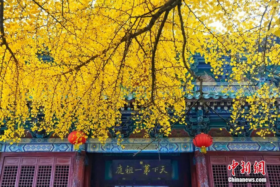 近日,河南登封嵩山少林寺内的千年古银杏树叶子变黄,犹如满树“披金”,进入最佳观赏季,吸引大量游客前来观赏。图为少林寺古银杏树叶子金黄如画卷。王羿 摄