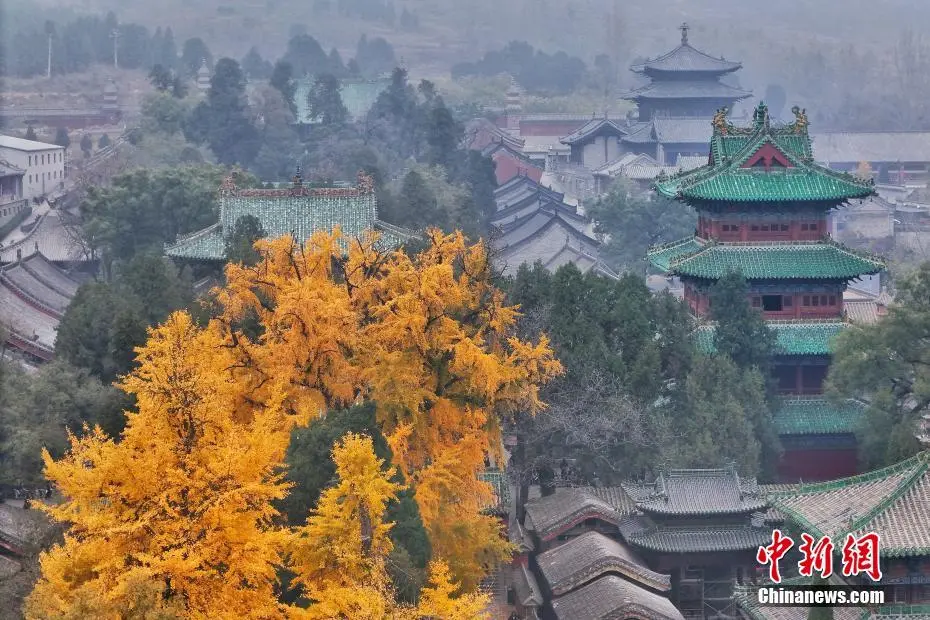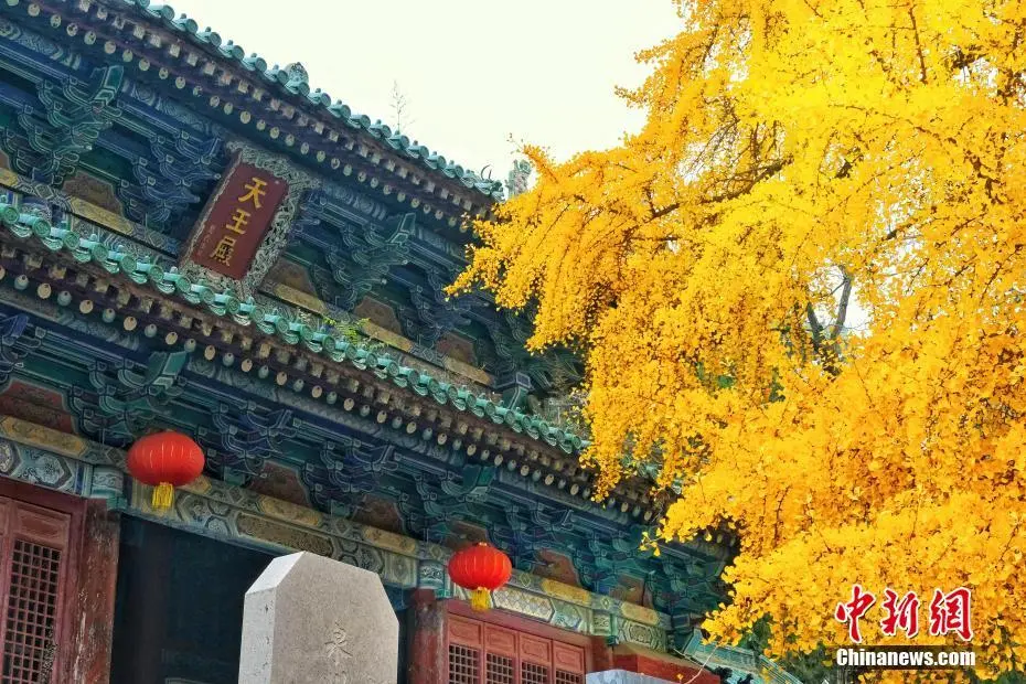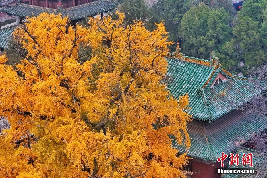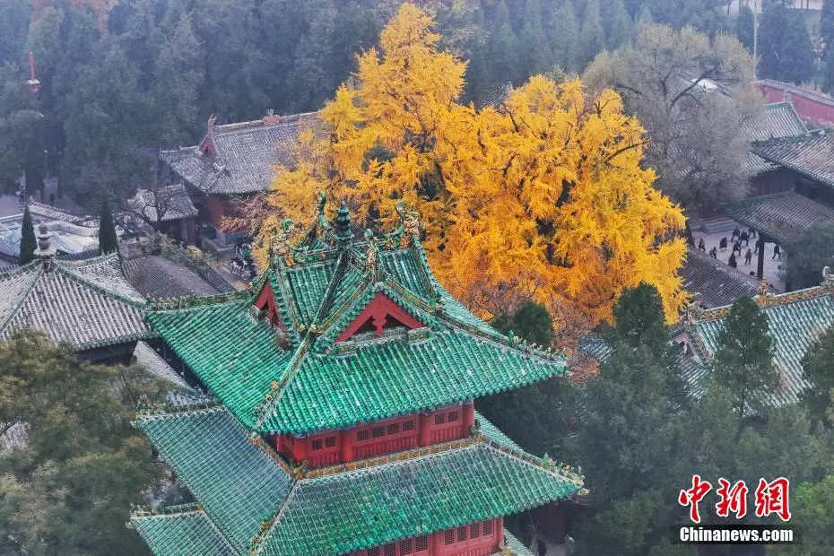 近日,河南登封嵩山少林寺内的千年古银杏树叶子变黄,犹如满树“披金”,进入最佳观赏季,吸引大量游客前来观赏。图为少林寺金黄的银杏树与古建筑相映衬。王羿 摄