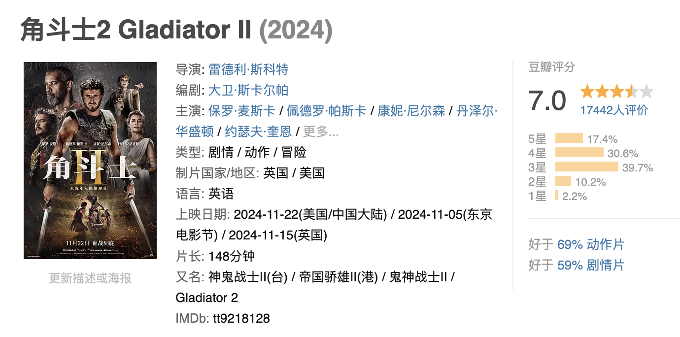 《角斗士2》豆瓣评分为7分,前作《角斗士》则有8.6分