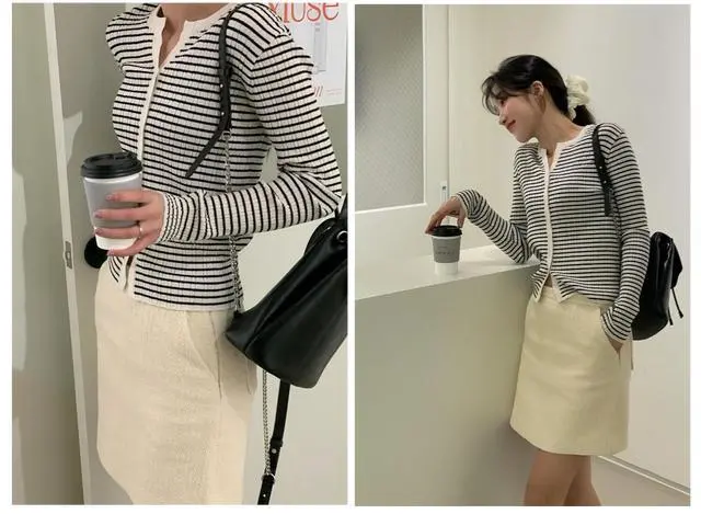 黑白细条纹开衫可以让造型更随意慵懒,条纹的间隙设计让上身的线条凹凸有致,而且针织的质感更有轻熟女味。