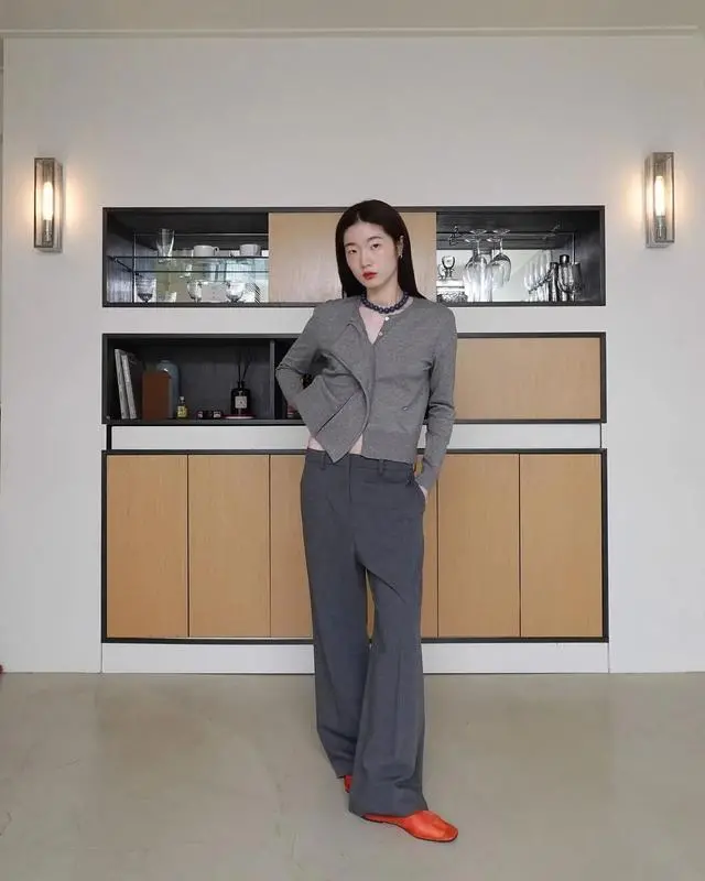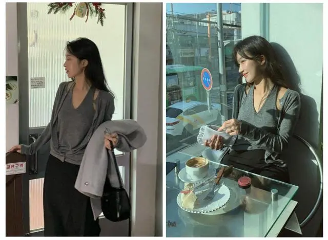 灰色开衫与针织深V背心的搭配也很出彩,秋冬也不用一味拘泥于穿得严实,偶尔大胆地露肤也很好看。