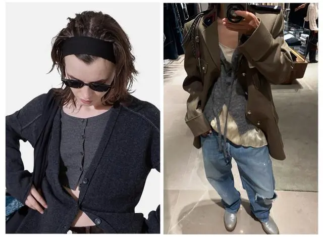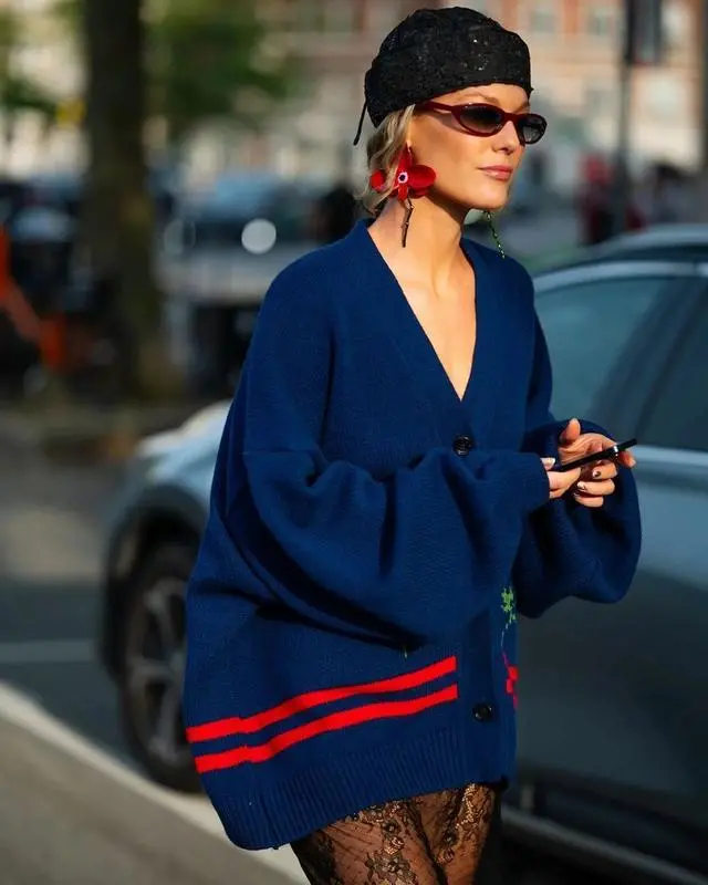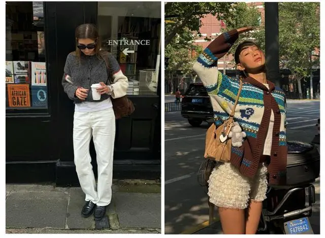 宽松的开衫似乎被附加了对精致感祛魅的功能,不需要规避什么穿衣原则,根据自己喜好随意搭配就可以。