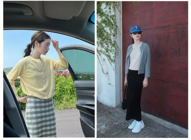 圆领开衫很适合搭配直筒半裙,柔和明亮的色彩与方格格纹搭配,油然而生出自然的田园风。而将运动类单品融入其中,也时髦得毫不违和。