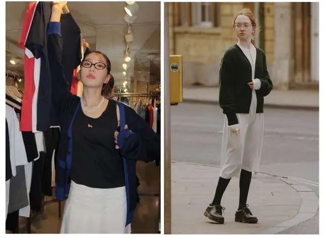 领口很有设计感的开衫则打破了开衫自带的正式感,不经意的细节点缀,再露出内搭,一下让整体造型变得很有个性。