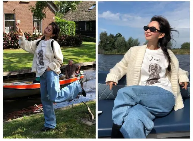 和杨超越的穿搭思路一样,博主feve__r也梳着马尾辫,穿着简洁的白色开衫,再简单地搭配条浅色牛仔裤,衬得整个人元气满满。