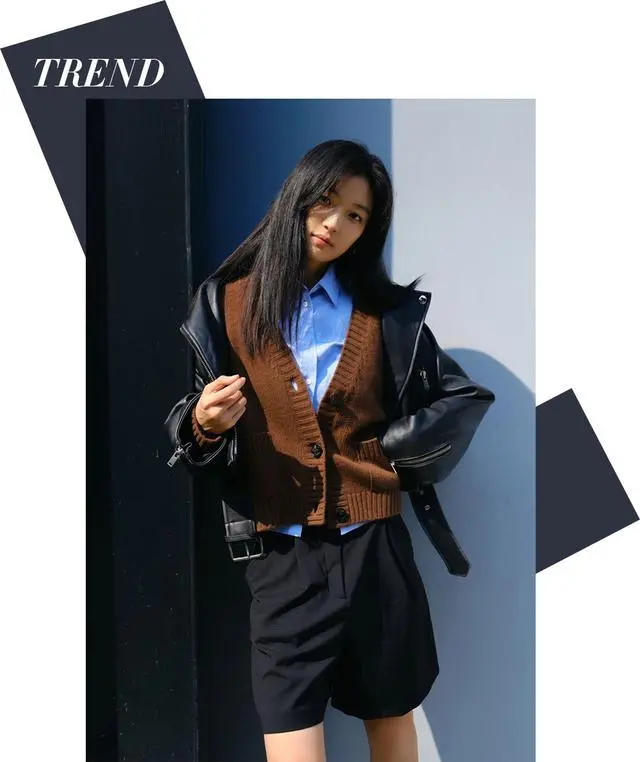 相比于圆领开衫,深V领口开衫的板型则更多样化。孙千上身的这件开衫,看似平淡常规,但很有复古味道,棕色系的温暖氛围,在蓝色衬衫和皮夹克的加持下,有股酷劲十足的疏离感。