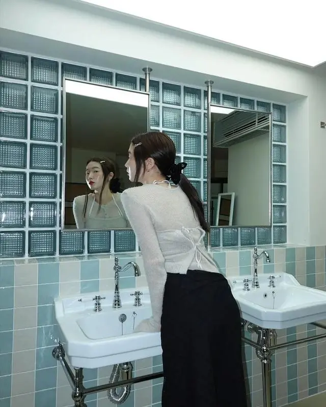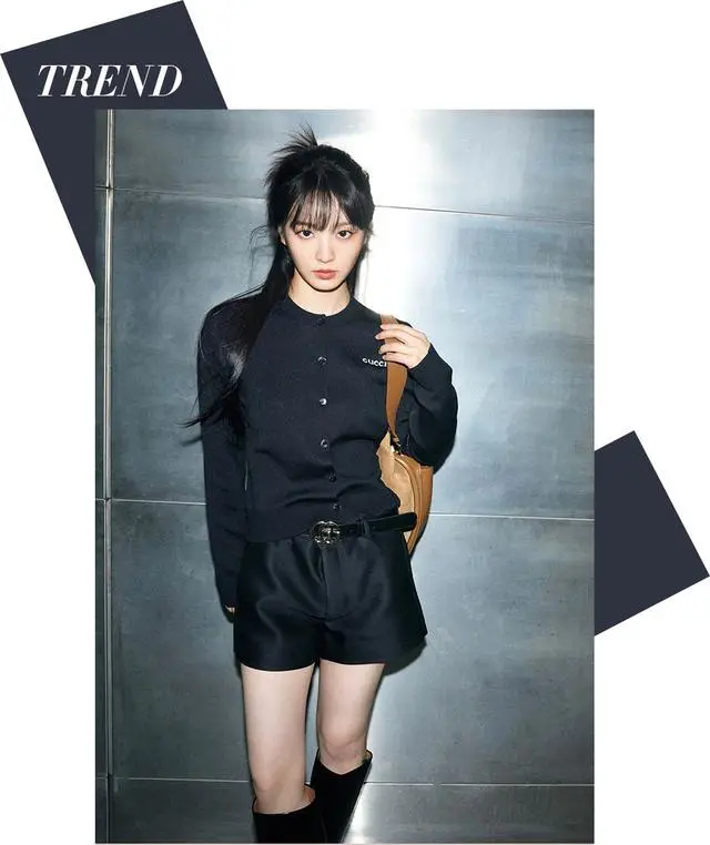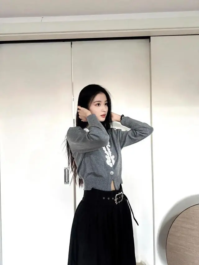 相比于其他款式,圆领开衫简洁干练,更多了些女性的柔美。像田曦薇这样,扎一个清爽的高顶马尾,全身黑色造型,很凸显气质。