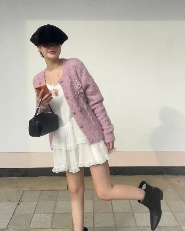 像今年热门的圆领开衫,更是经得起多种穿搭方式的推敲。赵佳丽这身娇嫩粉色开衫内搭青绿色毛衣,即使在冬天,也能让人感受到春意的浪漫。
