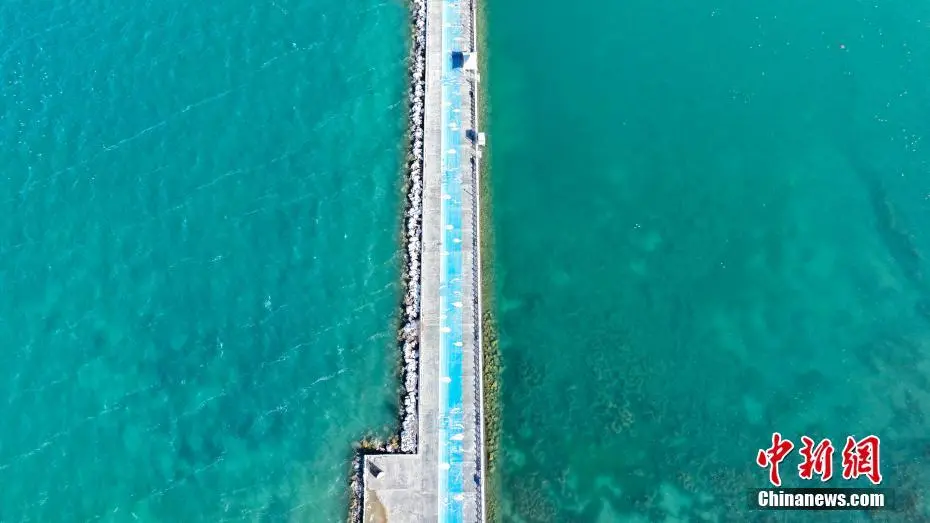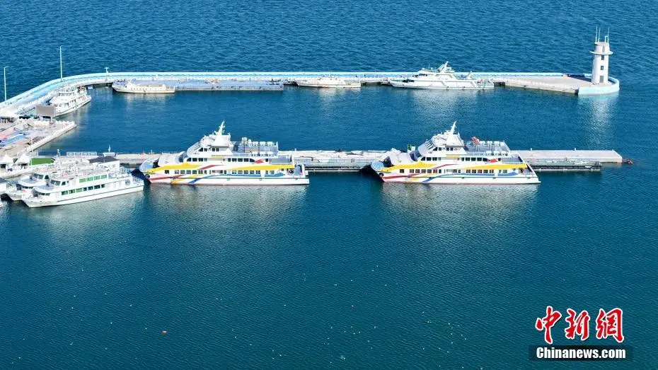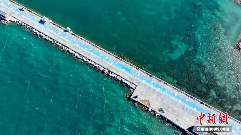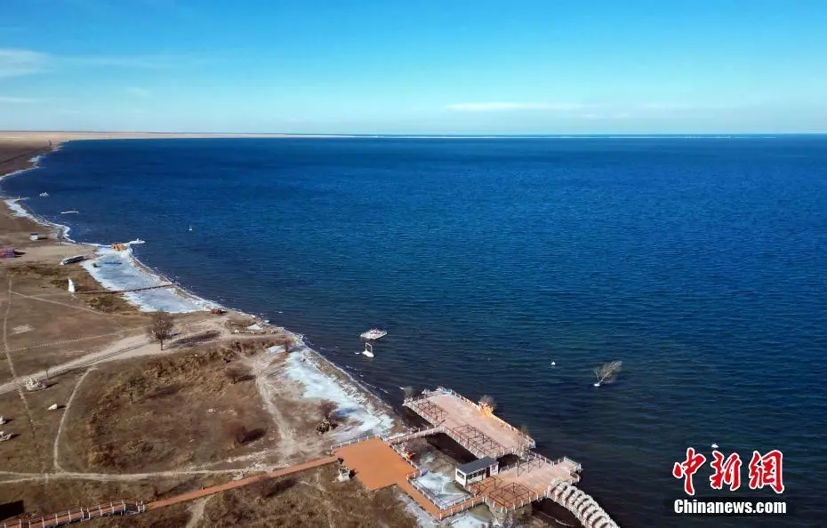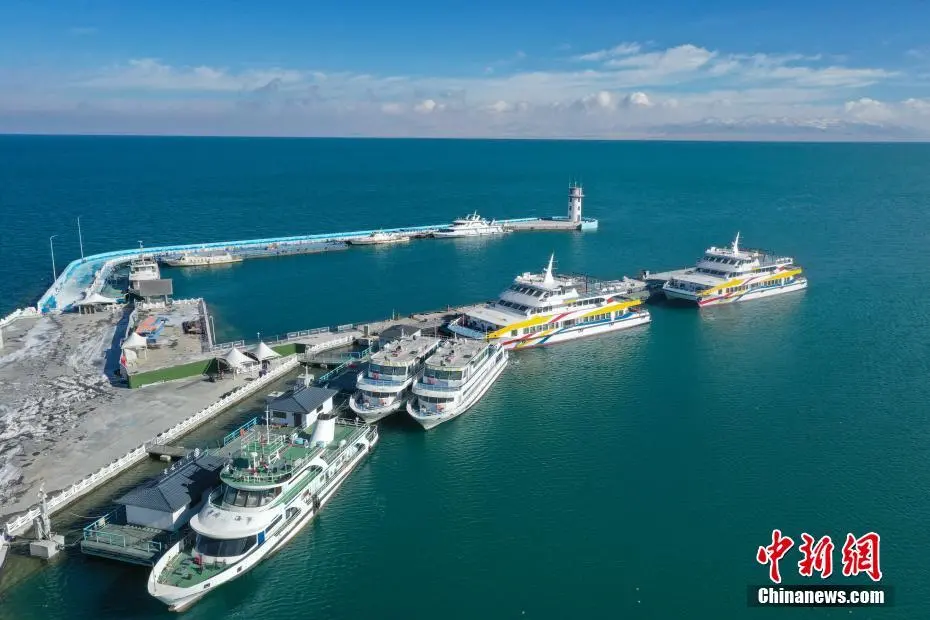 12月5日,在青海省海南藏族自治州共和县的青海湖二郎剑景区,青海湖湖水湛蓝如宝石,在阳光照耀下波光粼粼,与天空相映成趣,水天相接处难分彼此。图为青海湖码头停靠的船只。(无人机照片)中新社记者 薛蒂 摄