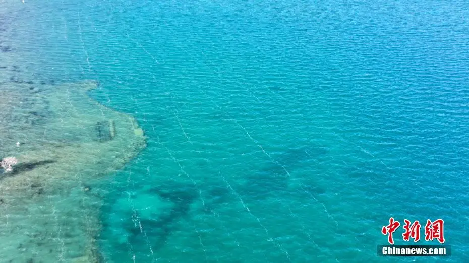 12月5日,在青海省海南藏族自治州共和县的青海湖二郎剑景区,青海湖湖水湛蓝如宝石,在阳光照耀下波光粼粼,与天空相映成趣,水天相接处难分彼此。图为青海湖一景。(无人机照片)中新社记者 薛蒂 摄