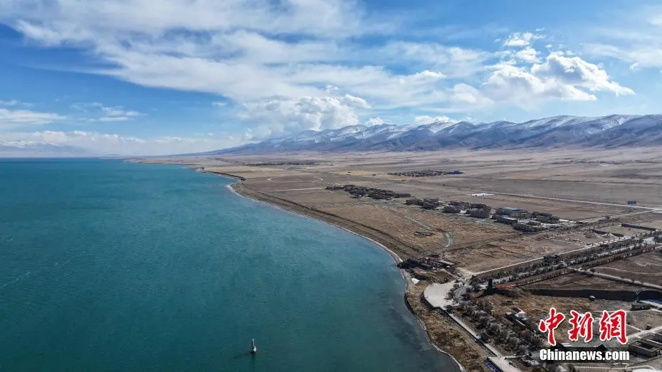 12月5日,在青海省海南藏族自治州共和县的青海湖二郎剑景区,青海湖湖水湛蓝如宝石,在阳光照耀下波光粼粼,与天空相映成趣,水天相接处难分彼此。图为青海湖畔冬日景色。(无人机照片)中新社记者 薛蒂 摄