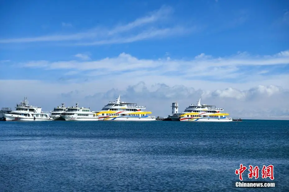 12月5日,在青海省海南藏族自治州共和县的青海湖二郎剑景区,青海湖湖水湛蓝如宝石,在阳光照耀下波光粼粼,与天空相映成趣,水天相接处难分彼此。图为青海湖码头停靠的船只。中新社记者 贡嘎来松 摄