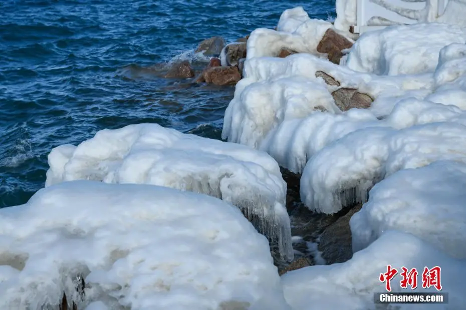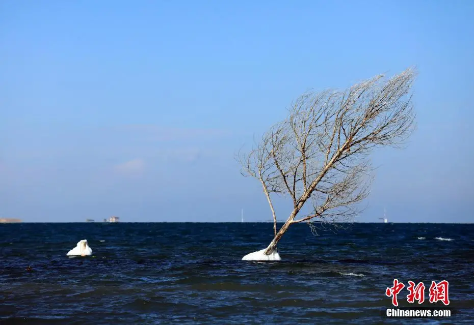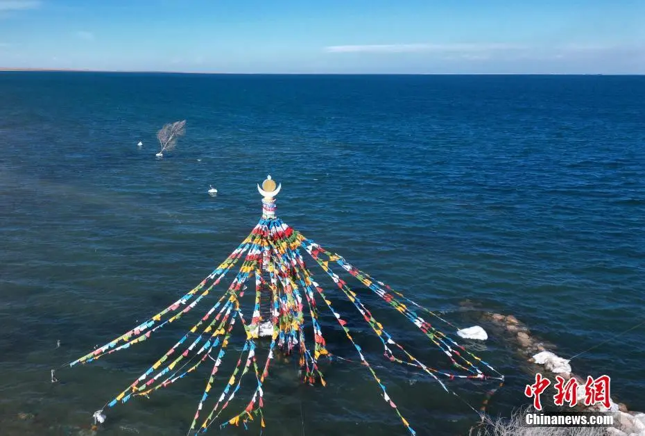 12月5日,在青海省海南藏族自治州共和县的青海湖二郎剑景区,青海湖湖水湛蓝如宝石,在阳光照耀下波光粼粼,与天空相映成趣,水天相接处难分彼此。图为青海湖湖畔冰封一角。中新社记者 贡嘎来松 摄