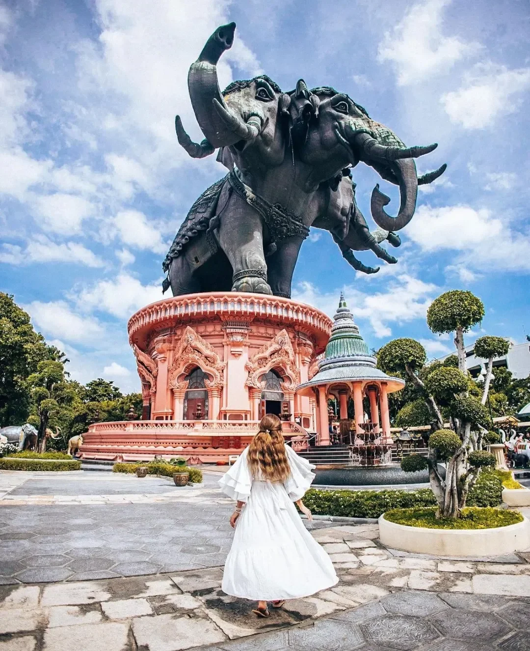 重达250吨、高16层楼的庞然巨象由纯铜精雕而成,连电梯都是安装在象腿儿里的!神殿大厅的粉嫩配色、内部极致的雕梁画栋也是出圈得很。