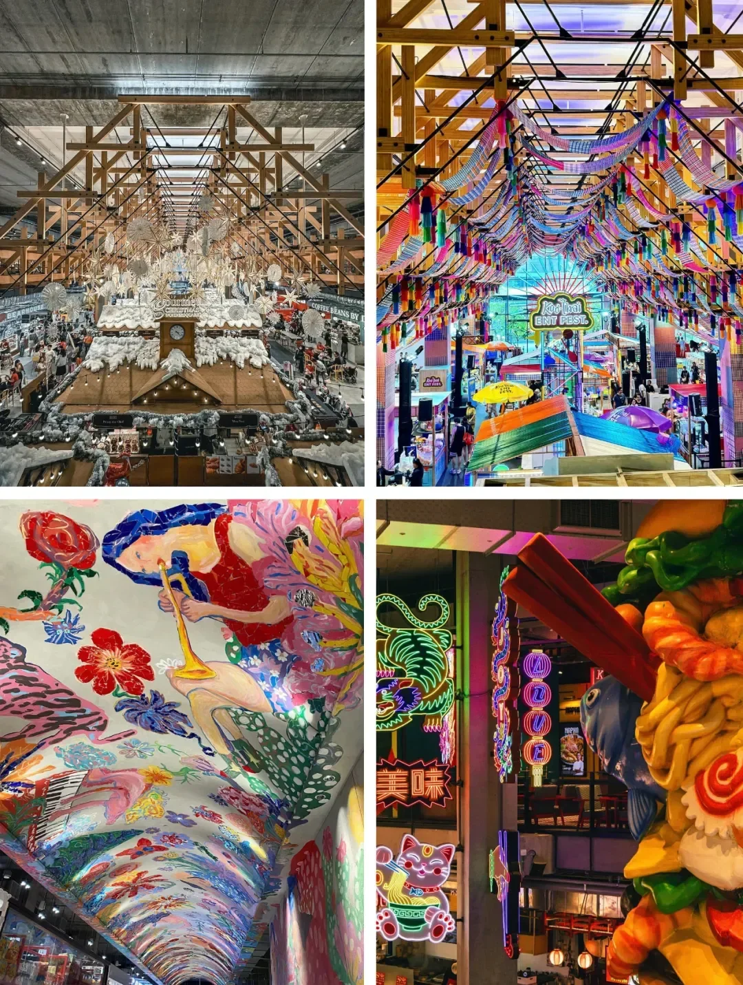 细节处的装饰元素也很“泰”,如穹顶壁画、布料帷幔、塑料餐盒堆积成的柱子,就这么水灵灵地传达出传统工艺+生态美的概念,配色大胆张扬,色彩星人一进去就走不动道了!