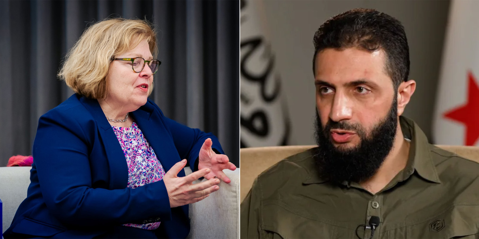 资料图:美国务院负责近东事务的助理国务卿芭芭拉·利夫(左),叙利亚“沙姆解放组织”(HTS)领导人艾哈迈德·沙拉(右)
