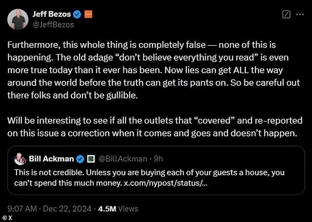 今天早上,贝佐斯在X上转发这条推文,更直言:“此外,整件事都是彻头彻尾的谎言——这一切都没有发生。”引发轩然大波。
