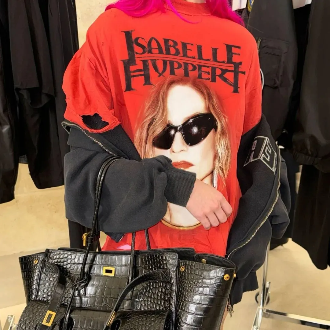 Isabelle Huppert最近就收获了Balenciaga秋季25系列为其准备的“粉丝纪念品”,一件印着她头像和名字的卫衣。这件衣服会作为商品在2025年中上市。这种“周边”过去似乎只有偶像、摇滚明星才会拥有,它们作为周边在演出之后的签售会、握手会贩卖给狂热的粉丝。Isabelle Huppert靠演技也拥有大量追随者。