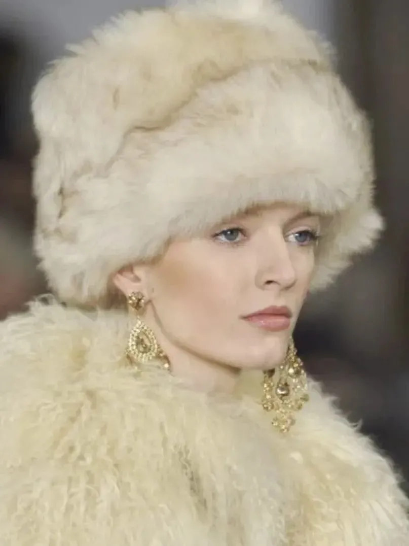另一种是复古貂毛帽,翻看90年代秀场、电视剧,这种帽子很常见,和大号耳环组合可是冬日奢华标配。
