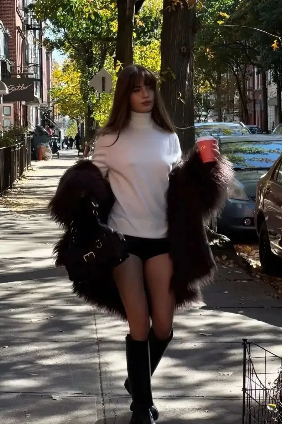 博主 Mara Lafontan 这样黑丝搭长筒靴,露肤度十足,把老娘不怕冷就喜欢这样写在了脸上,也是一种时髦的穿搭格式。