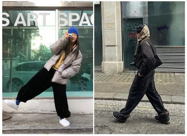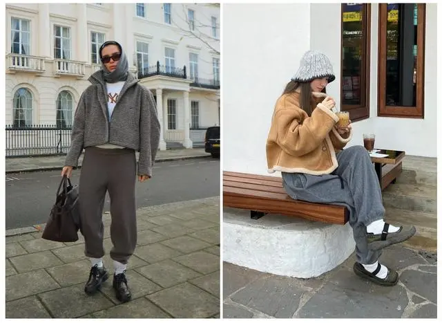厚实的灰色运动裤,给冬天增添了不少松弛感,裤子线条的垂坠感,优化身材,也很适合用袜子将裤脚裹起来,舒服且时髦感加分。